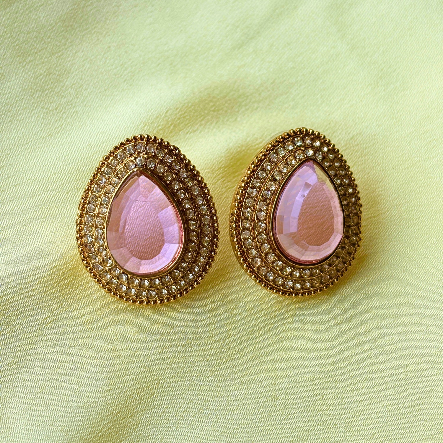 Add timeless elegance to your look with these Trendy Gold Plated Pink Stone Stud Earrings. Designed with a stunning teardrop-shaped pink stone surrounded by shimmering crystals, these earrings are the perfect blend of glamour and sophistication. Whether for daily wear, parties, weddings, or festive occasions, these earrings will make you stand out effortlessly.