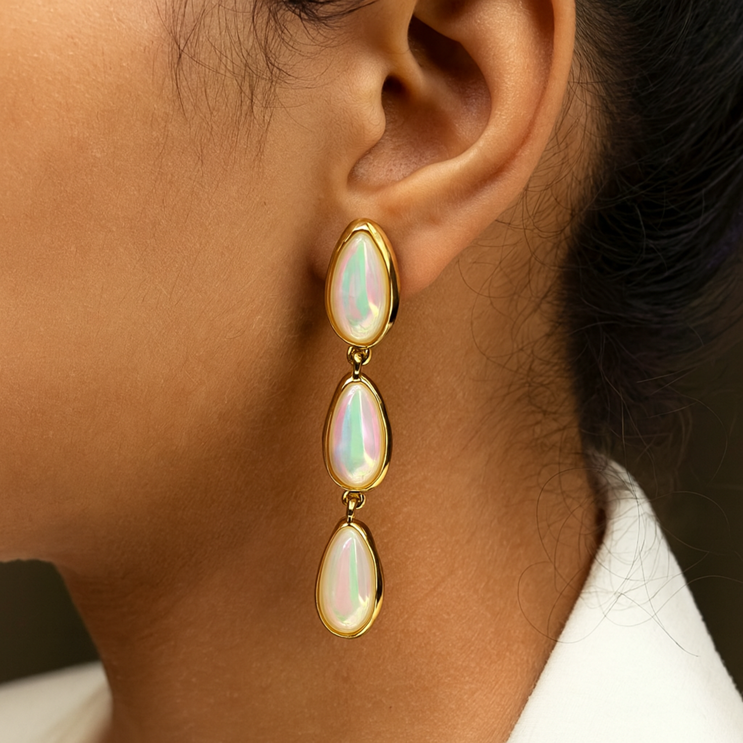 - Design: Elegant triple drop earrings with iridescent teardrop stones