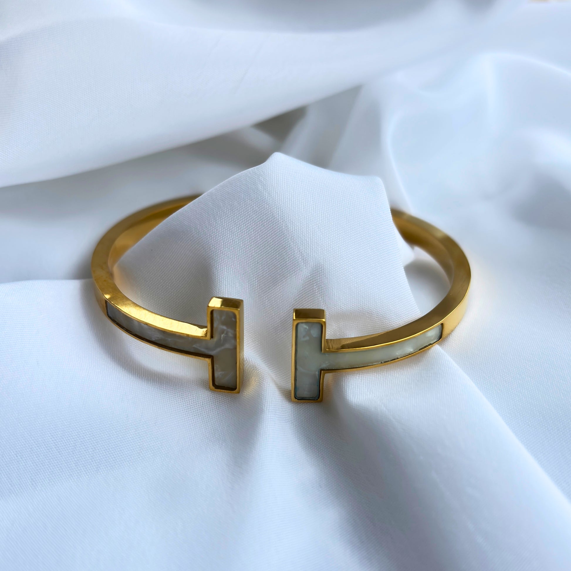 Add a touch of elegance to your jewellery collection with this modern gold-plated open cuff bracelet. Featuring a sleek white stone-textured inlay, this bracelet is perfect for women who love chic and versatile accessories. Designed with anti-tarnish technology and a 100% waterproof finish, it ensures long-lasting shine and durability, making it a must-have for both everyday wear and special occasions.